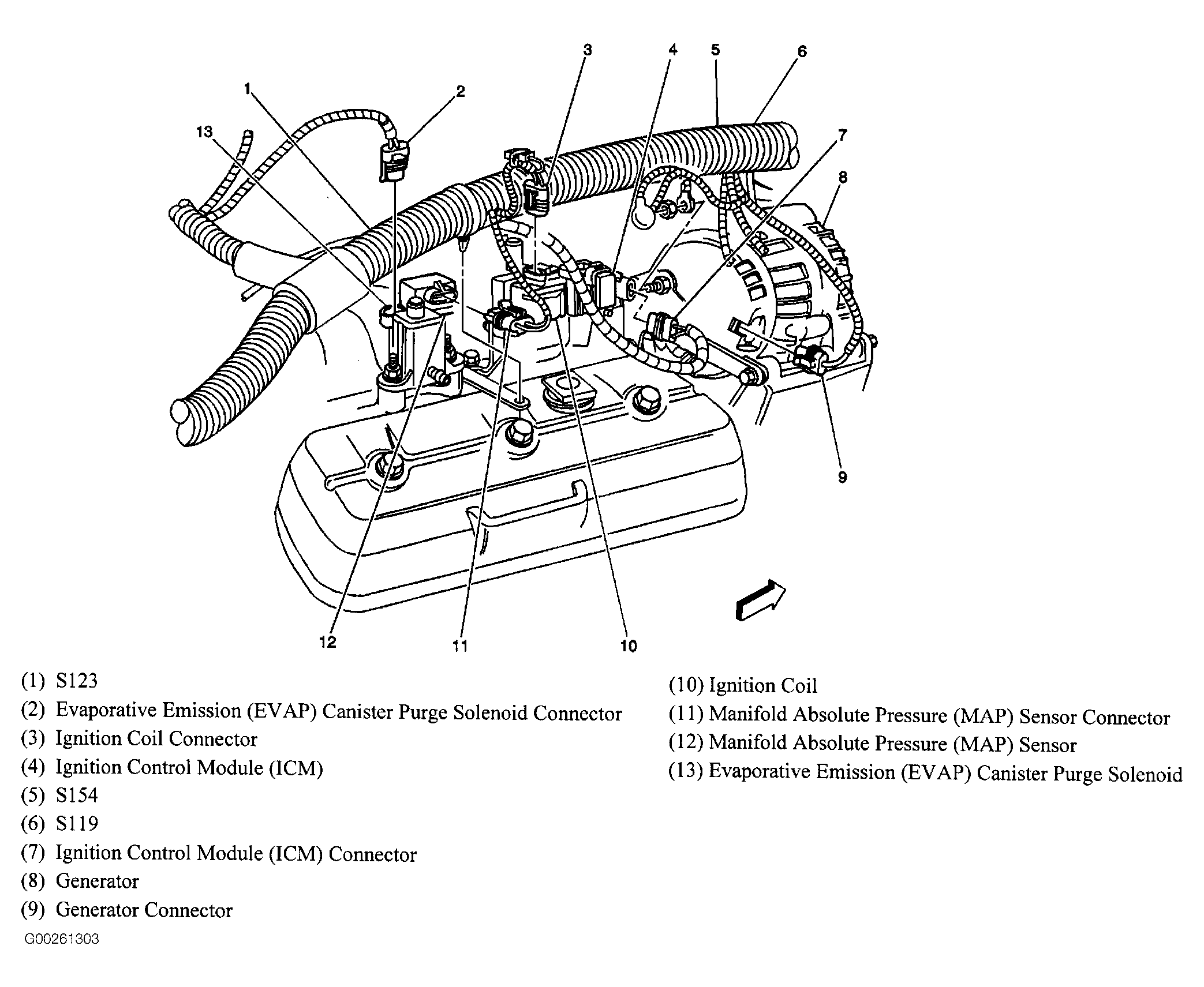 | Ignition Control Module (ICM) | Top of engine, front of coil. See Figure . |