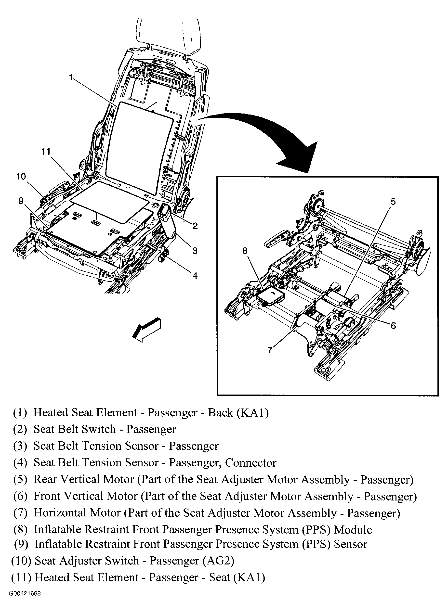 Inflatable Restraint Front Passenger Presence System (PPS) Module Under front passenger seat. See Figure.