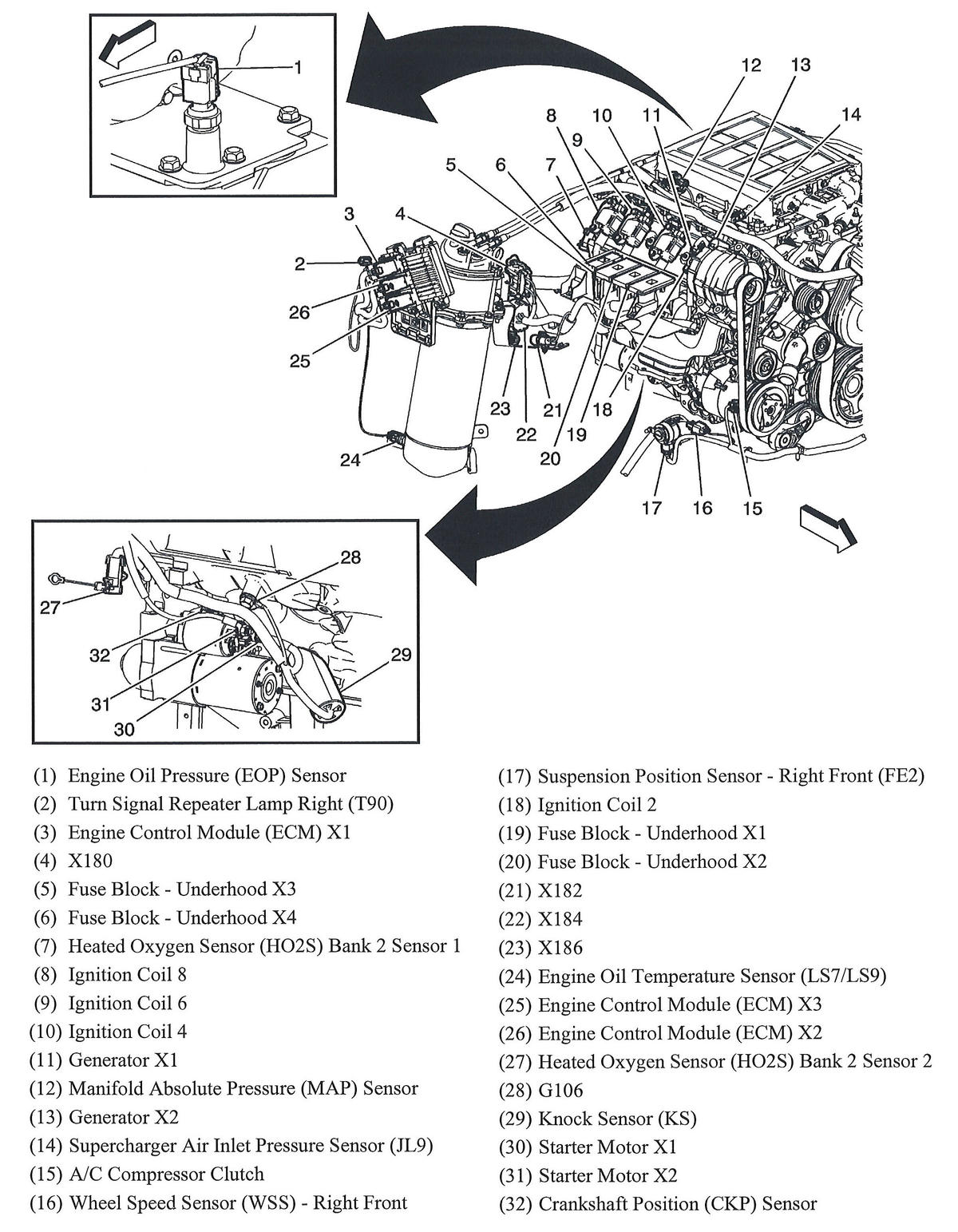 | Engine Control Module (ECM) (6.2L) (Supercharged) | Right side of engine compartment. See Figure. |