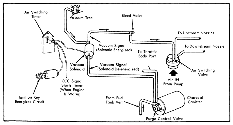 An air switching timer (on Firewall) is used by the CCC to provide air switching. As soon as the engine coolant sensor indicates to the computer that coolant is warm, it starts a 70 second timer. At the end of 70 seconds, a signal is sent to a vacuum solenoid, which allows vacuum to operate the air switching valve. Air is directed "downstream" to the converter. If the engine is warm when started, the 70 second timer is started immediately. See Figure.