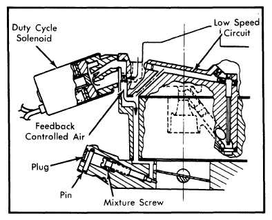 All models are equipped with feedback carburetors which contain an electronically operated duty cycle solenoid. This solenoid meters the main fuel system of carburetor and operates in parallel with the conventional fixed main metering jets. The computer controls the operation of the solenoid with electrical signals, in response to signals received from data sensors. See Fig 1.