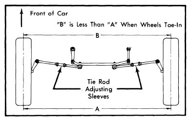 1. Measure toe-in with front wheels in straight ahead position and steering wheel centered. To adjust toe-in, loosen clamps and turn adjusting sleeve or adjustable end on right and left hand tie rods. See Figure and Fig 1.