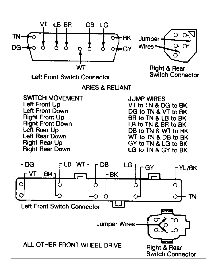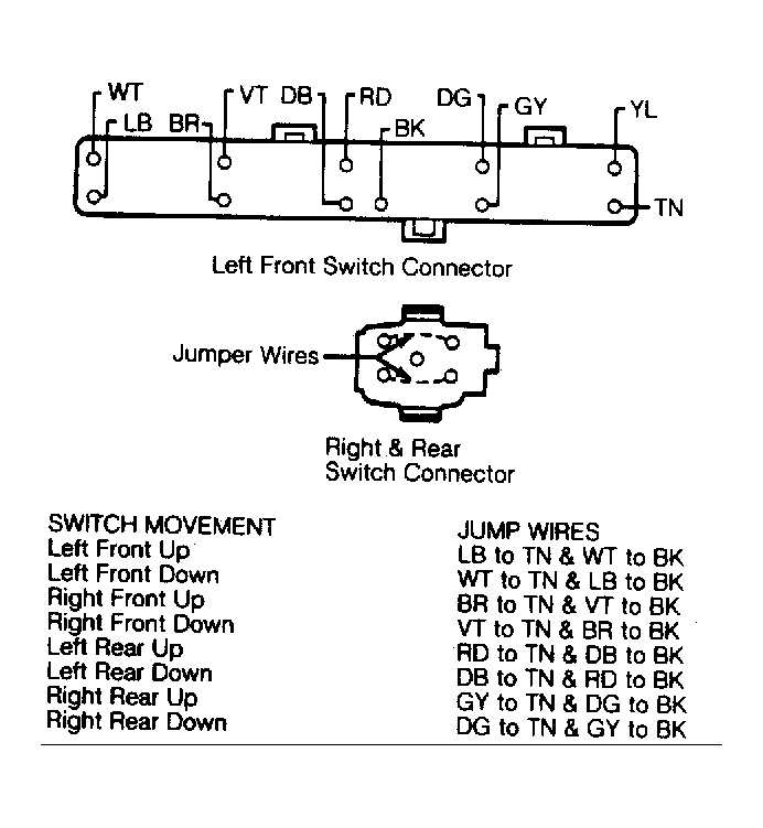 - If failure is in passenger or rear door, connect jumper wires to that switch connector as shown in Fig 1 or Fig 2 , depending on model. Check operation of motor by making jumper connections on left front main switch connector as shown in Fig 1 and Fig 2 .