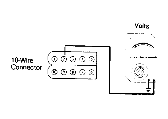 - If voltage was not at least 5 volts, turn ignition off. Disconnect 10-wire connector from computer. Turn ignition switch back to the "RUN" position. Connect positive voltmeter lead to terminal 2 of 10-wire connector and negative lead to ground. See Fig 3 . Voltage reading should again be within 1 volt of battery voltage. If not, check wiring between terminal 2 and ignition switch for opens, shorts or poor connections.