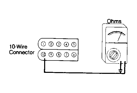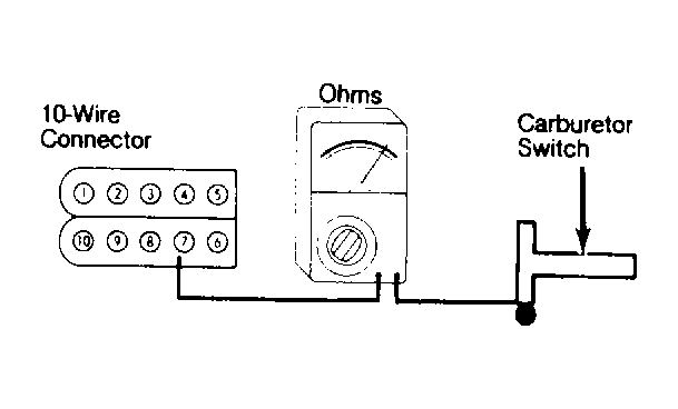 - If voltage at terminal 2 was correct, turn ignition off. Using an ohmmeter, check continuity between terminal 7 of 10-wire connector and carburetor switch terminal. See Fig 4 . Continuity should exist. If not, check wire between connections for opens, shorts or poor connections. If continuity is present, use an ohmmeter with leads attached to terminal 10 and engine ground to check continuity of ground circuit. See Fig 5 . If there is continuity, replace computer. If there is no continuity, check wire from terminal 10 to ground. Recheck continuity between terminal 7 of 10-wire connector and carburetor switch. Try to start engine. If engine fails to start, proceed to next step.
