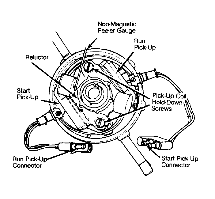 NOTE: To adjust gap, loosen pick-up coil hold-down screws, move pick-up coil against feeler gauge, resting against reluctor tooth. Tighten hold-down screw, remove feeler gauge and recheck gap.