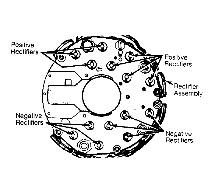 - Connect one ohmmeter lead to negative heat sink. Connect other ohmmeter lead to each of negative rectifier pins and test for continuity. See Figure. Reverse ohmmeter leads and retest.