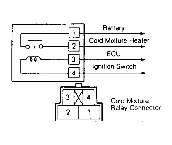 Remove cold mixture heater relay. With battery voltage applied to terminals No. 3 and 4, there should be no continuity between terminals No. 1 and 2. With no battery voltage applied, terminals No. 1 and 2 should have continuity. See Fig 1 .