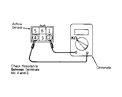 Disconnect airflow sensor connector. Check intake air temperature sensor by measuring resistance at terminals 2 and 4. Replace airflow sensor assembly if readings are not to specifications. See Fig 1 .