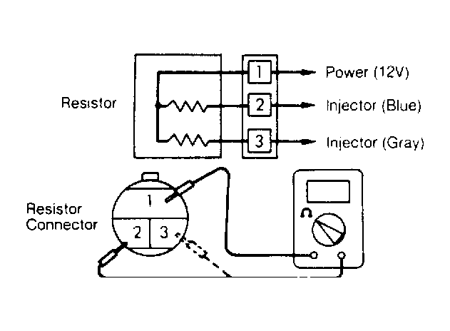 Disconnect electrical connector from resistor. Connect Harness (MD998459) to resistor side of disconnected connector. Measure resistance across terminals No. 1 and 2, then No. 1 and 3. See Fig 1 . Resistance should be between 5.5 and 6.5 ohms in both cases. If not, replace resistor.