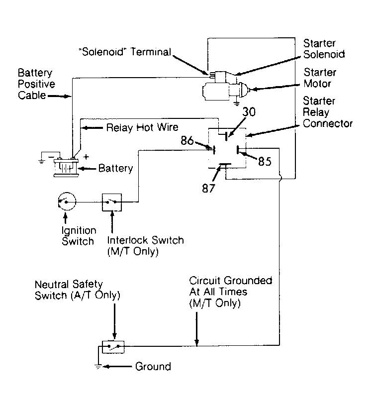 All models use a starter relay in starter circuit between the battery and starter solenoid terminal. Automatic Transmission (A/T) equipped vehicles use a neutral safety switch to provide ground path for the starter relay. Manual Transmission (M/T) equipped vehicles use a clutch pedal interlock switch to provide battery voltage from ignition switch to the starter relay. See Fig 1 .
