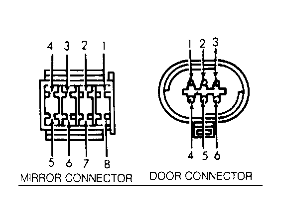 - Connect one end of jumper wire to 12-volt source. Connect one end of second jumper wire to a good body ground. Connect remaining end of each jumper wire to specified pins on harness side (not switch side). See appropriate POWER MIRROR MOTOR TEST table. If mirror operation is not as specified in table, check circuit for broken or shorted wire. If wiring is okay, replace mirror assembly as necessary.