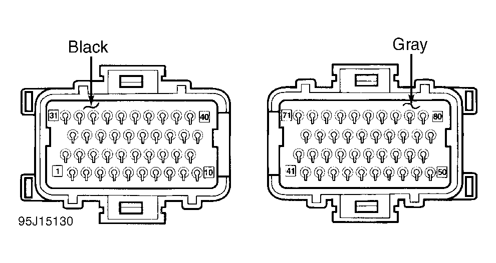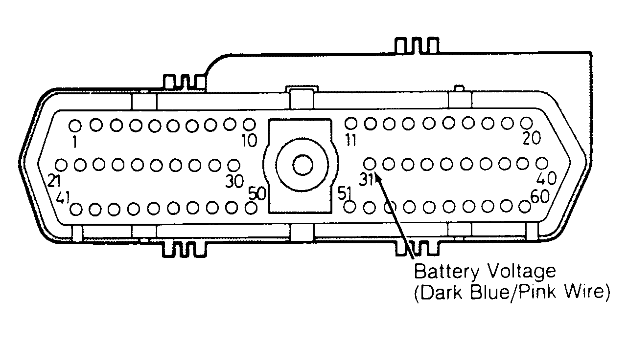 - With ignition off, disconnect 60-pin connector from PCM. PCM is located on left front corner of engine compartment. Turn ignition on. Check for battery voltage at proper cavity of connector. To identify the proper cavity, see PCM PIN IDENTIFICATION table. Also see Fig 1 or Fig 2 . If battery voltage exists and female terminal is not damaged, replace PCM. If voltage does not exist, repair open or short in Dark Blue/Pink wire from radiator fan relay to PCM.