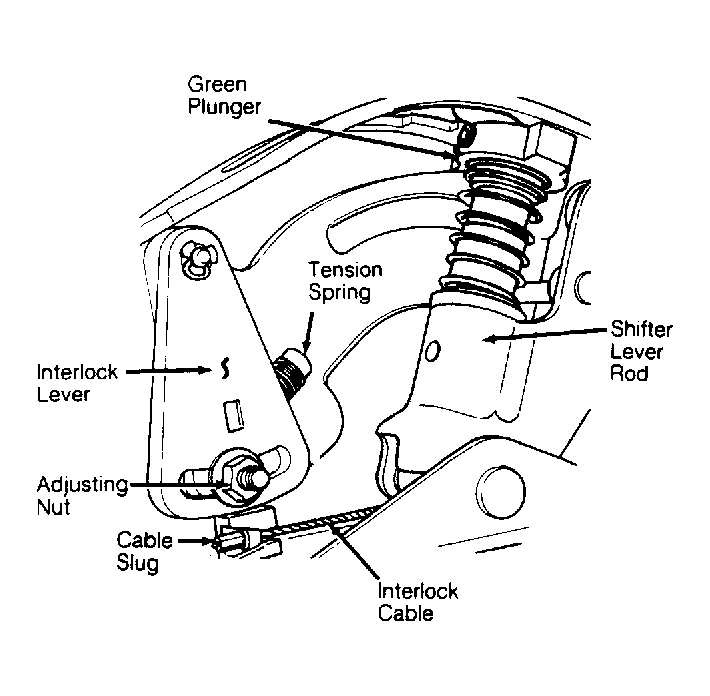 - Ensure cable slug is seated in interlock lever. Rotate ignition switch to ACC position. Loosen interlock lever adjusting nut to allow tension spring to center interlock lever on shift bracket assembly.