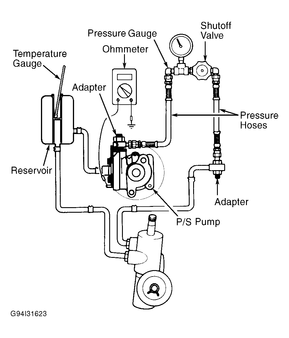 - Disconnect pressure hose from pump. Connect Adapter (MB991217 on turbo or SOHC models, and MB991548 on non-turbo or DOHC models) to pump outlet. Connect Adapter (MB990994 on turbo or SOHC models, and MB991549 on non-turbo or DOHC models) to steering gear hose. Connect pressure hoses and Pressure Gauge (MB990662). See Figure . Start engine, bleed air from system and turn steering wheel several times with vehicle not moving until power steering fluid temperature reaches about 122-140°F (50-60°C).