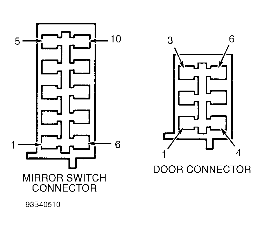 Using Trim Stick (C-4755), remove power mirror switch from mounting. Disconnect wire connector. Using 2 jumper wires, connect one to a 12-volt source and the other to a good ground. If tests do not agree with POWER MIRROR MOTOR TEST , check for open or shorted circuit, or replace mirror assembly as necessary. See Fig 1.