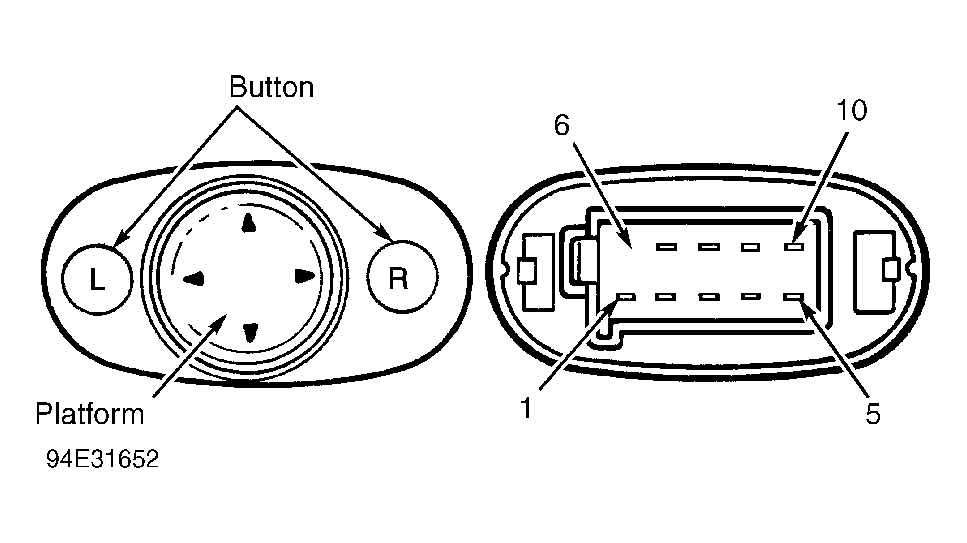 Remove power mirror switch from mounting. Disconnect wiring harness at switch connector. Using an ohmmeter, check continuity between power mirror switch terminals with the switch in the appropriate position(s). See the POWER MIRROR SWITCH CONTINUITY TEST . See Figure. If results differ from table, replace switch.