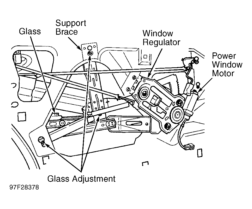 Remove door trim panel. See DOOR TRIM PANEL under REMOVAL & INSTALLATION. Loosen lower scissor channel mounting bolt. See Fig 2 . Loosen support brace-to-door panel bolt. Loosen scissor channel-to-support brace nut. Position glass in weatherstrips to achieve smooth operation. Tighten scissor channel bolts/nut. Install door trim panel.