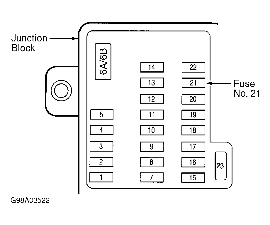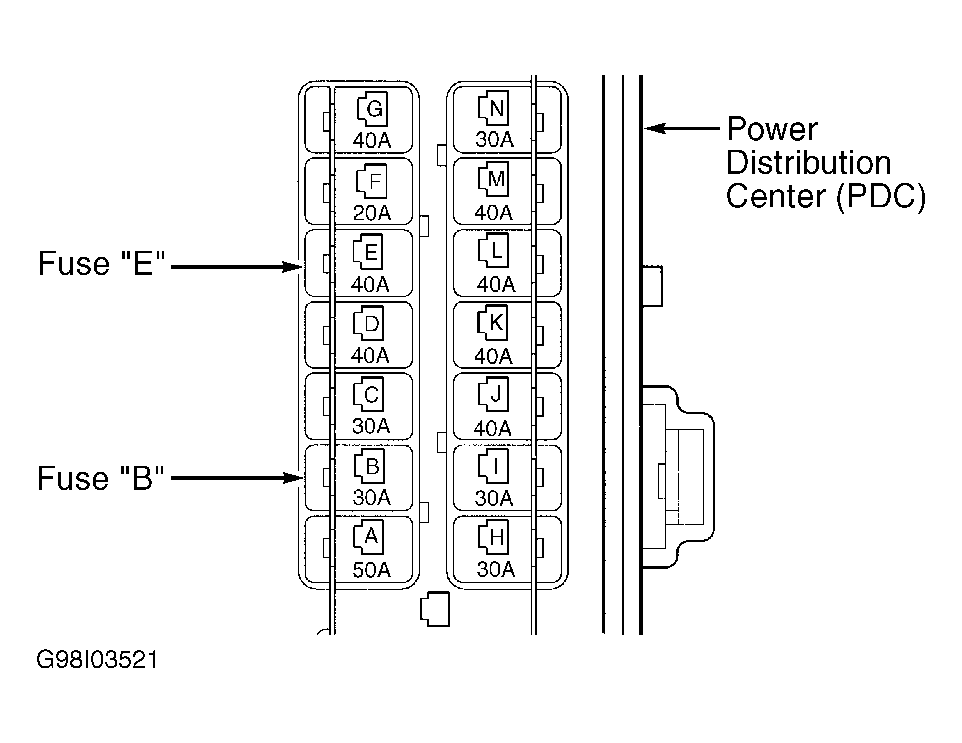 - With ignition on and engine at normal operating temperature, check for battery voltage on both sides of fuse "B" (30-amp on 2000; 40-amp on 2001) and fuse "E" (40-amp) in power distribution center located in engine compartment. See Fig 1. Also check fuse No. 21 (10-amp) in junction block located above left kick panel. See Fig 2.