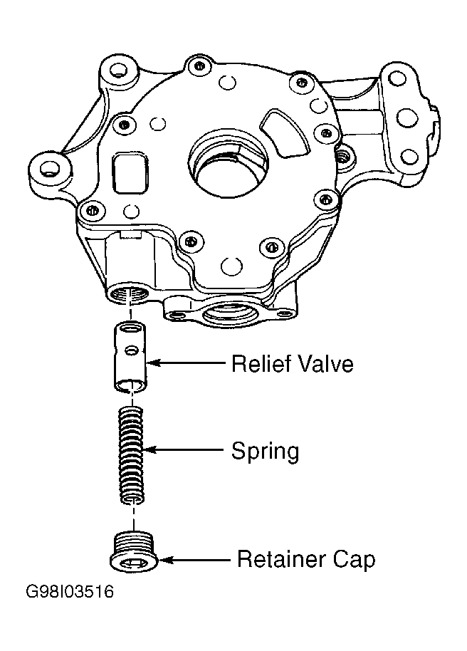 - Ensure pressure relief valve slides freely in bore and is free from scoring. If small marks are present, they may be removed using 400-grit dry sandpaper. Check free length and pressure of pressure relief valve spring. Replace spring if it is not within specification. See OIL PUMP SPECIFICATIONS table.