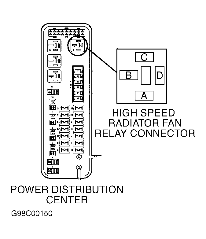 1. Turn ignition on. Using scan tool, actuate high speed radiator fan relay. Locate high speed radiator fan relay. High speed radiator fan relay is located in Power Distribution Center (PDC). See Fig 1. If high speed radiator fan relay cycles on and off, go to next step. If high speed radiator fan relay does not cycle on and off, stop relay actuation and go to step  4.