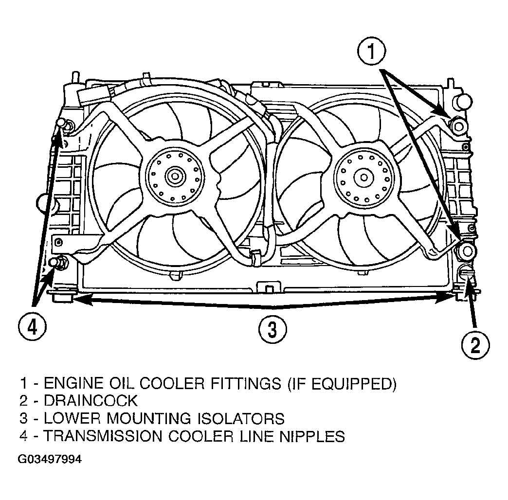 - Position radiator into engine compartment. Seat the radiator assembly lower rubber isolators into the mounting holes in radiator lower support (Figure).
