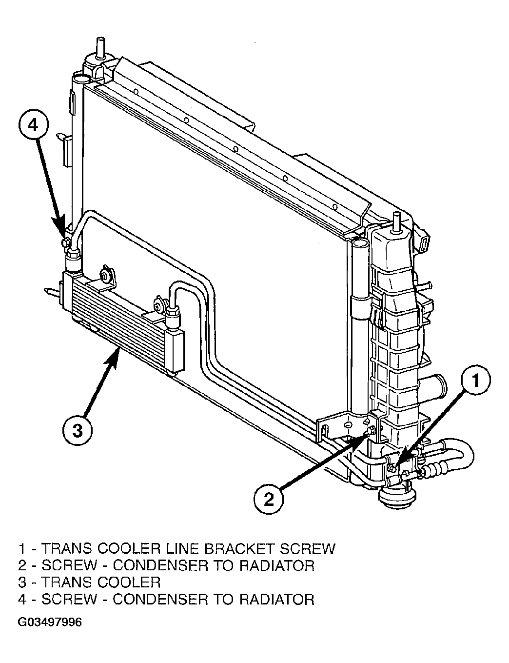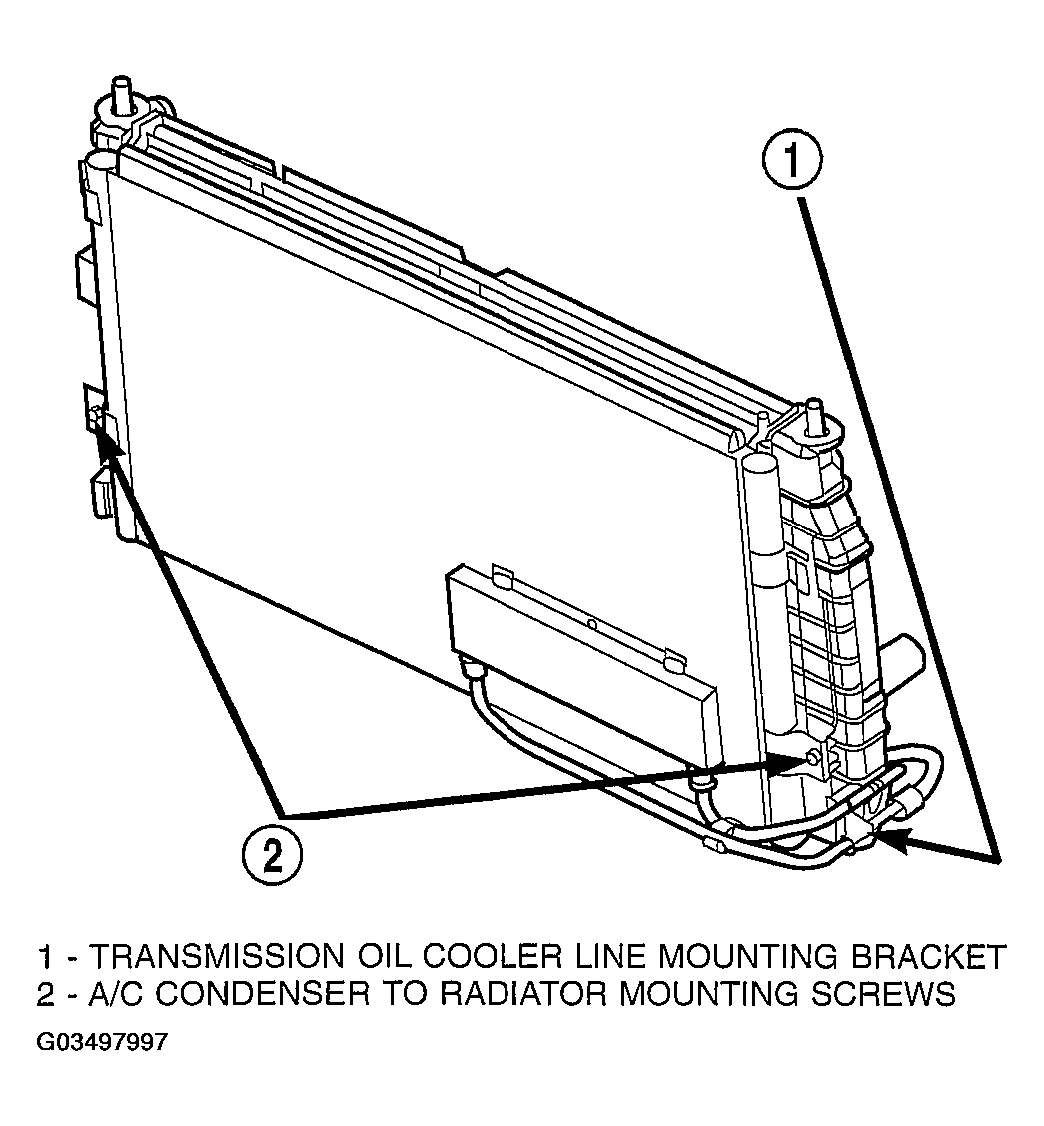 - Attach air conditioning condenser to, mounting clips on radiator. Install mounting screws and tighten to 5 N.m (45 in.lbs.) (Figure) or (Figure).