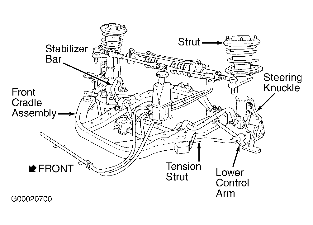 Front suspension is MacPherson strut type. Top of strut assembly connects to strut tower through a rubber isolated mount. Bottom of strut assembly bolts to steering knuckle by 2 serrated bolts. Lower control arm is mounted between cradle assembly and steering knuckle. Ball joint is an integral part of lower control arm. A tension strut is used to control front-to-rear movement of lower control arm. See Fig 1 .