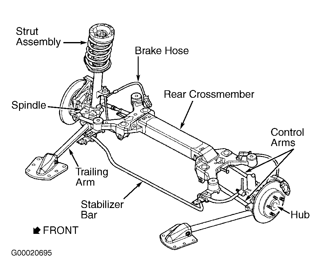 Rear suspension uses a MacPherson strut independent design. See Fig 1 . Each side consists of a strut assembly, 2 parallel control arms, trailing arm, spindle and strut-mounted stabilizer bar.