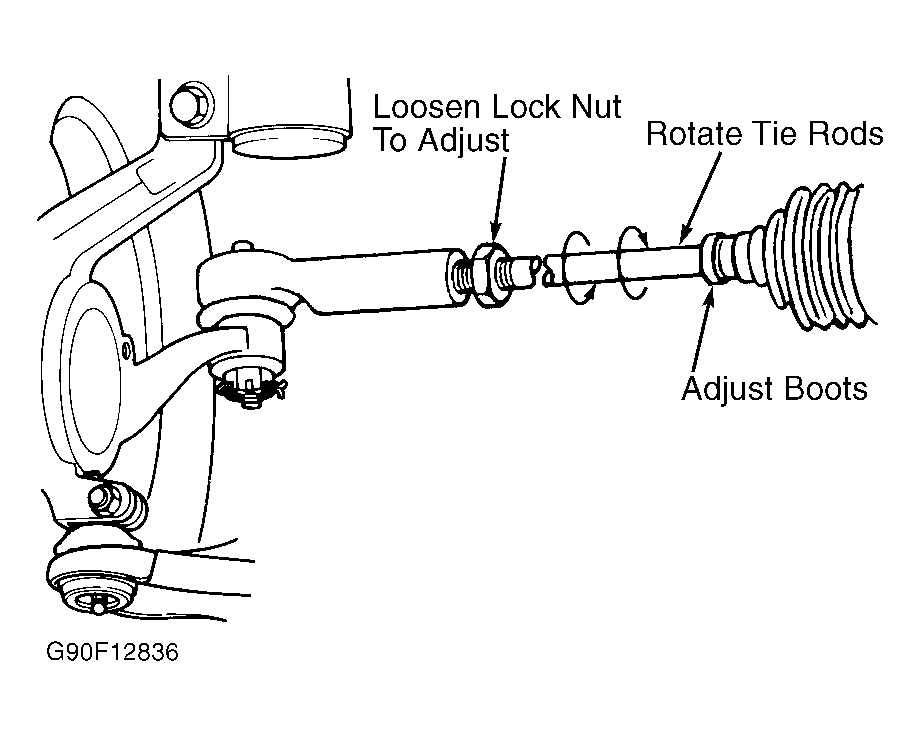 With steering wheel centered, loosen tie rod end lock nuts or pink bolt. While holding steering rod dust boots stationary, rotate tie rods or tie rod adjustment sleeve to obtain specified toe-in. See WHEEL ALIGNMENT SPECIFICATIONS . See Fig 1. Tighten lock nuts to specification. See TORQUE SPECIFICATIONS .