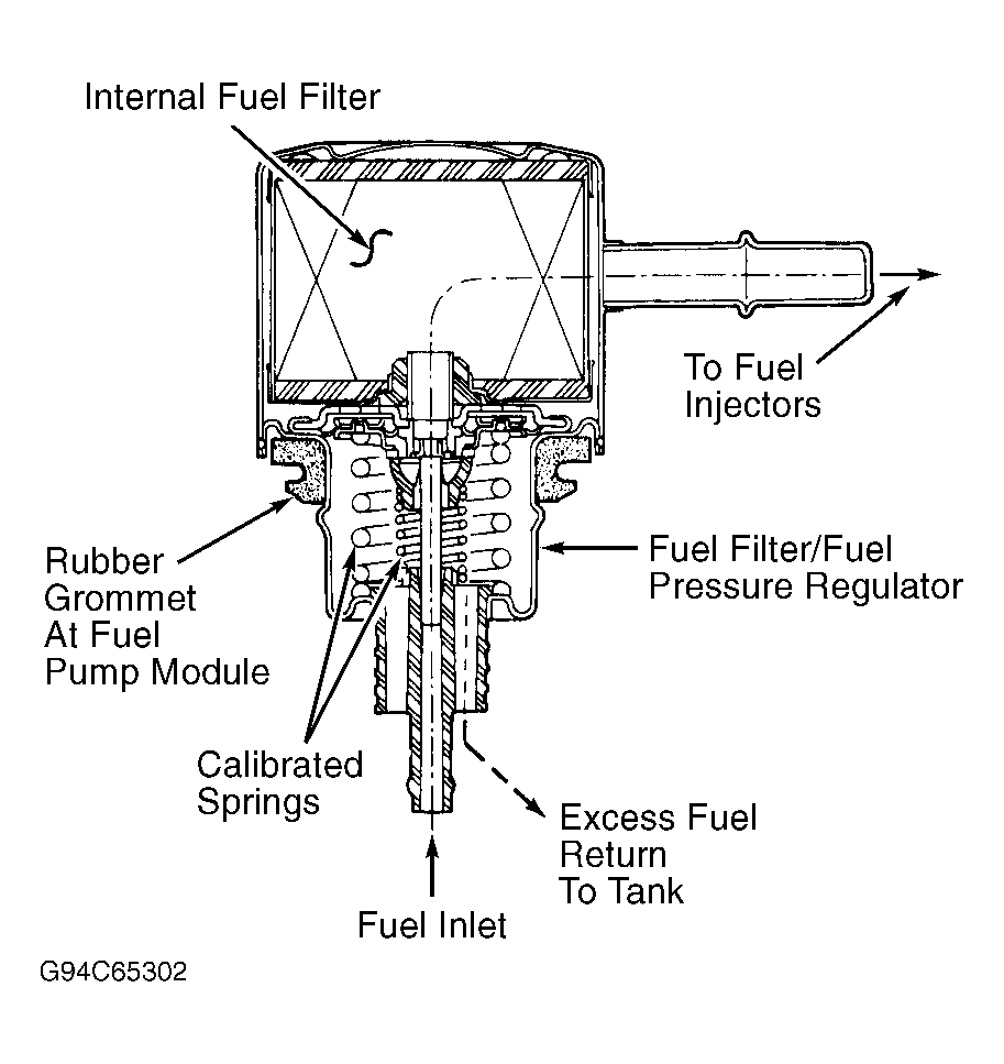 Fuel pump is a positive displacement, immersible pump with a permanent magnet electric motor. Fuel is drawn in through a separate filter/strainer at bottom of fuel pump and pushed through filter to fuel outlet line (to fuel injectors). Voltage to operate pump is supplied from fuel pump relay.