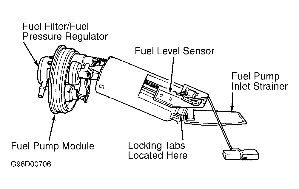 Fuel pump module is located in fuel tank. Fuel pump module includes electric fuel pump, inlet strainer, fuel gauge sending unit and fuel filter. See Fig 1 . On all models except Sebring Coupe and Stratus Coupe, fuel pressure regulator is part of fuel filter. See Fig 2 . On Sebring Coupe and Stratus Coupe, fuel pressure regulator is located on fuel rail.