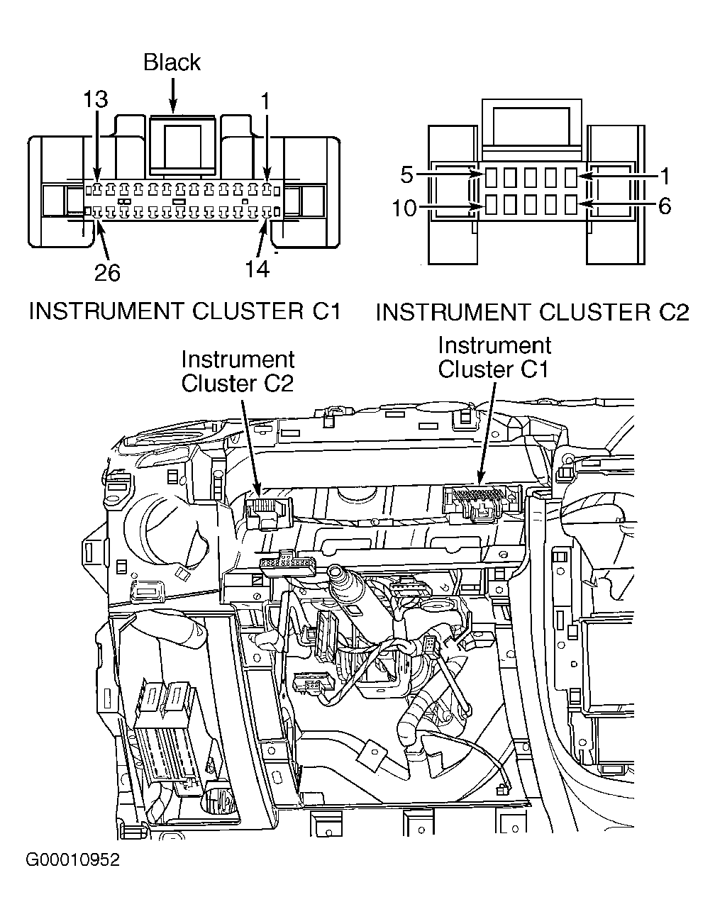 - Remove instrument cluster. See ANALOG INSTRUMENT PANELS - PT CRUISER article. Turn ignition on. Measure voltage between instrument cluster harness connector C2 terminal No. 9 (Dark Blue wire) and ground. See Figure. If no voltage exists, go to next step. If any voltage exists, repair short to voltage on Dark Blue wire.