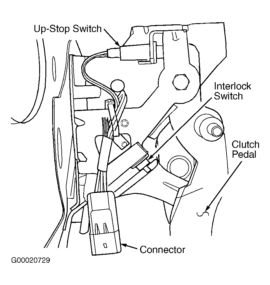 Using an ohmmeter, check for continuity between interlock switch connector terminals No. 2 and 3 with clutch depressed. See Figure and Figure . Continuity should exist. Check for continuity between switch connector terminals with clutch released. Continuity should not exist. If continuity is not as specified, replace interlock switch.