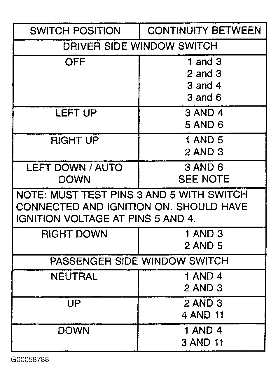 - Test power window switch continuity charts to determine if continuity is correct in Neutral, Up and Down switch positions. See Fig 1