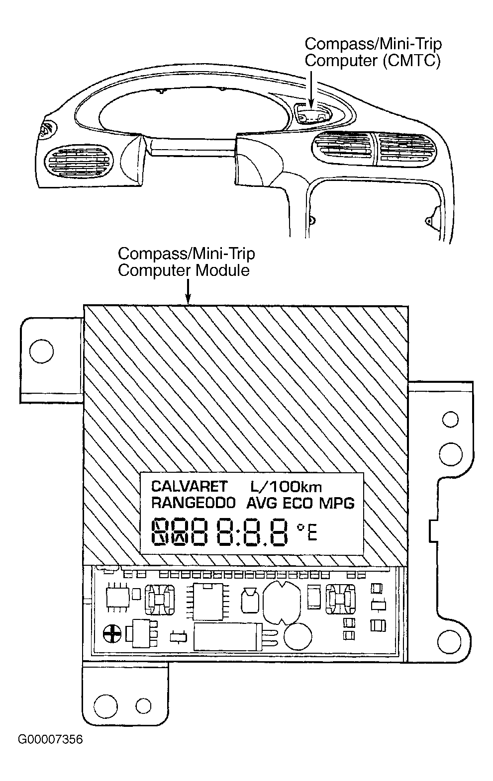Available only on Sebring Convertible, Compass/Mini-Trip Computer (CMTC) is located on right side of instrument cluster. See Figure . This dual-function display provides a digital readout of ambient (outside) temperature and 8 primary compass readings to indicate direction in which vehicle is facing.