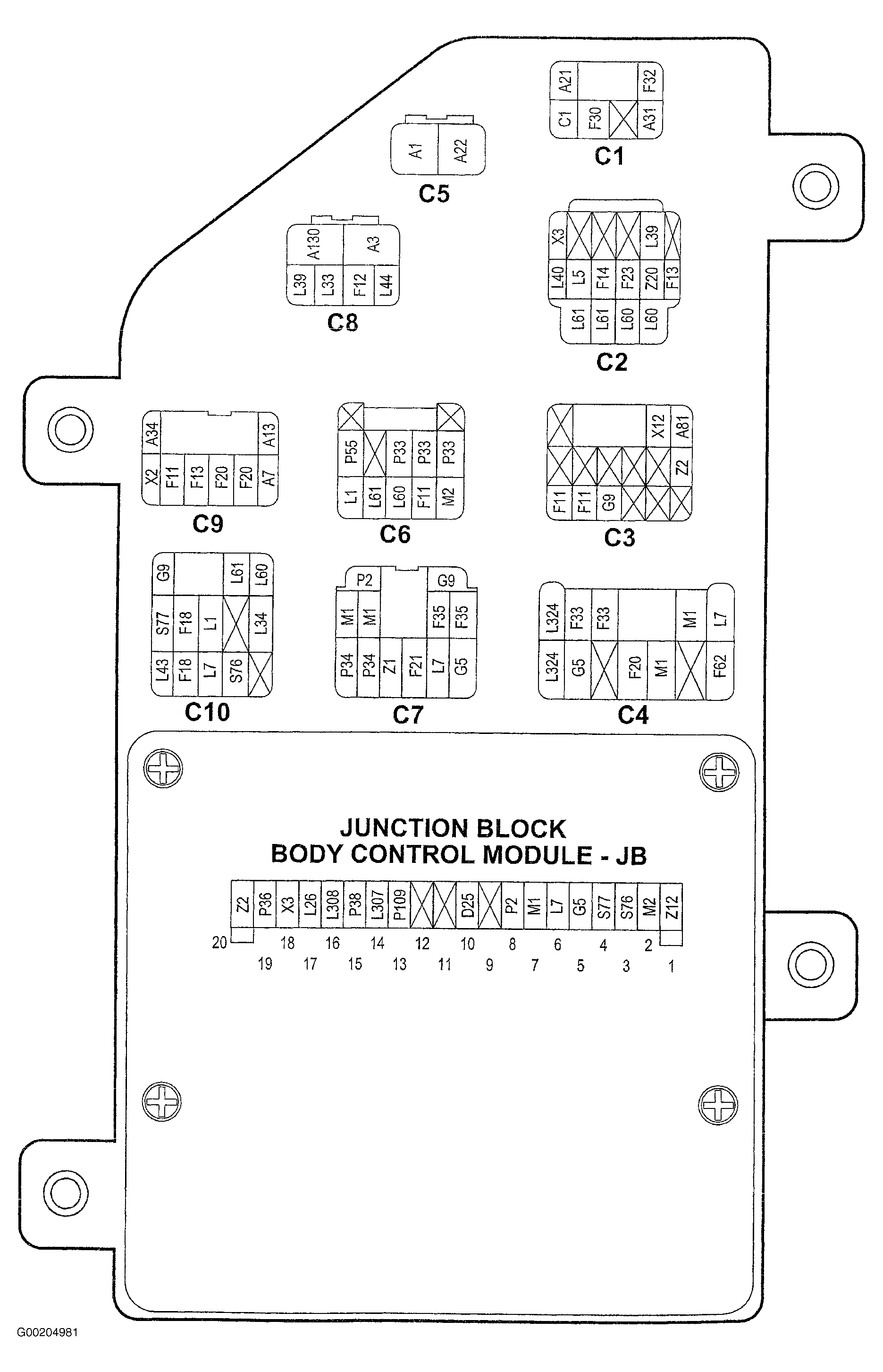 2. Turn ignition off. Remove Body Control Module (BCM) from back of junction block. Turn ignition on. Using a 12-volt test light connected to ground, probe terminal No. 7 at BCM connector on back of junction block. See Figure and Figure . If test light illuminates, replace BCM. See BODY CONTROL MODULE  under REMOVAL & INSTALLATION. If test light does not illuminate, go to next step.