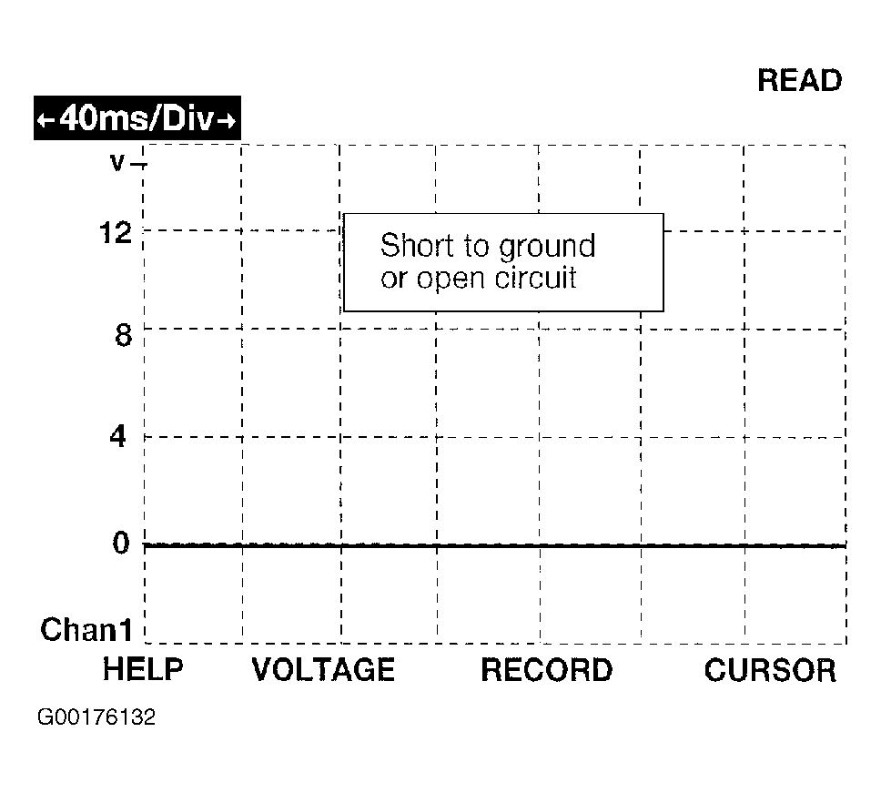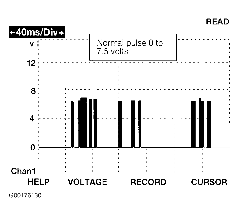 11. Connect Black lead to chassis ground. Connect Red lead to PCM harness connectors, PCI bus circuit (Violet/Yellow wire). Turn ignition on. Observe voltage display on scan tool lab scope. If voltage pulses from zero to about 7.5 volts, replace PCM. See Figure -Figure . See POWERTRAIN CONTROL MODULE  under REMOVAL & INSTALLATION. If voltage does not pulse from zero to about 7.5 volts, leave PCM connector disconnected and go to next step.