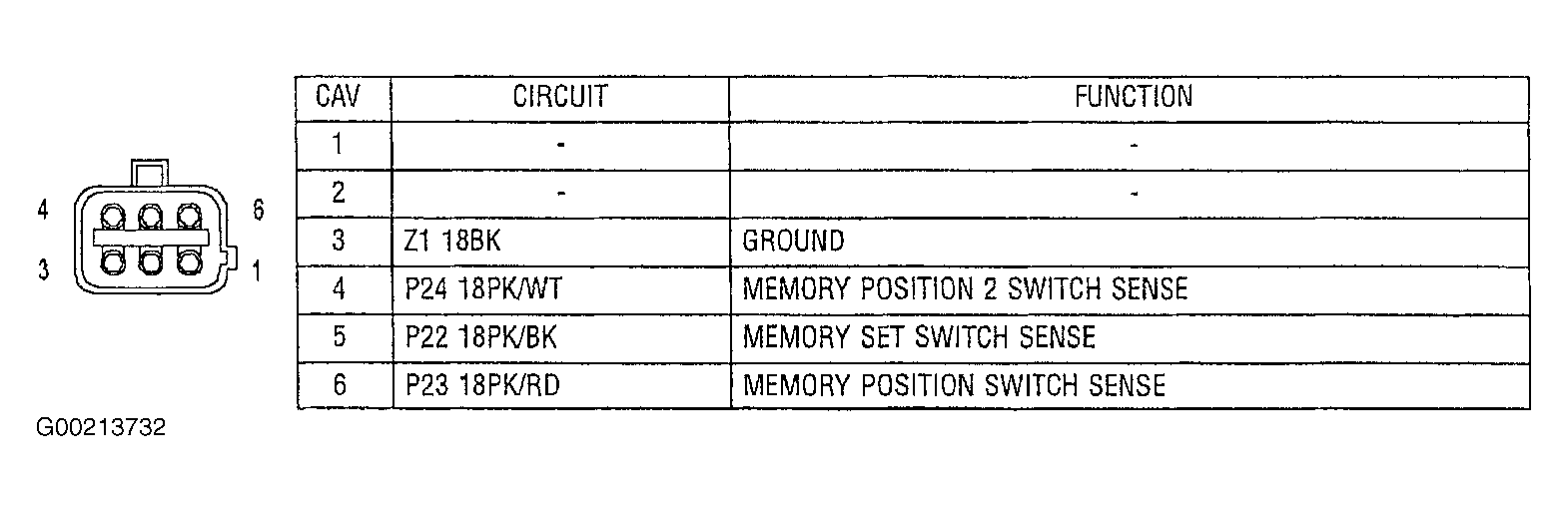 - Turn ignition off. Disconnect Memory Heated Seat/Mirror Module (MHSMM) connector C1. Measure resistance between ground and memory set switch connector terminal No. 5, memory set switch sense circuit switch sense circuit (Pink/Black wire). See Figure . If resistance is less than 100 ohms, repair short to ground in Pink/Black wire. If resistance is 100 ohms or more, replace MHSMM. See MEMORY HEATED SEAT/MIRROR MODULE under REMOVAL & INSTALLATION.
