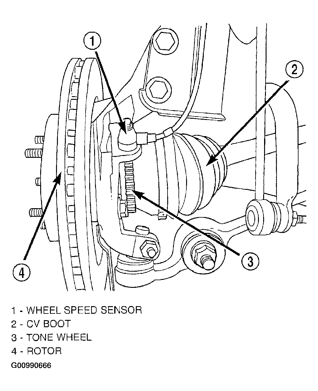 This system uses two-wire wheel speed sensors known as active wheel speed sensors. One wheel speed sensor (WSS) and one tone wheel is located at each front and rear wheel. Each front wheel speed sensor is attached to a boss in the steering knuckle (Fig 1 ). The front tone wheel is part of the outboard constant velocity joint.