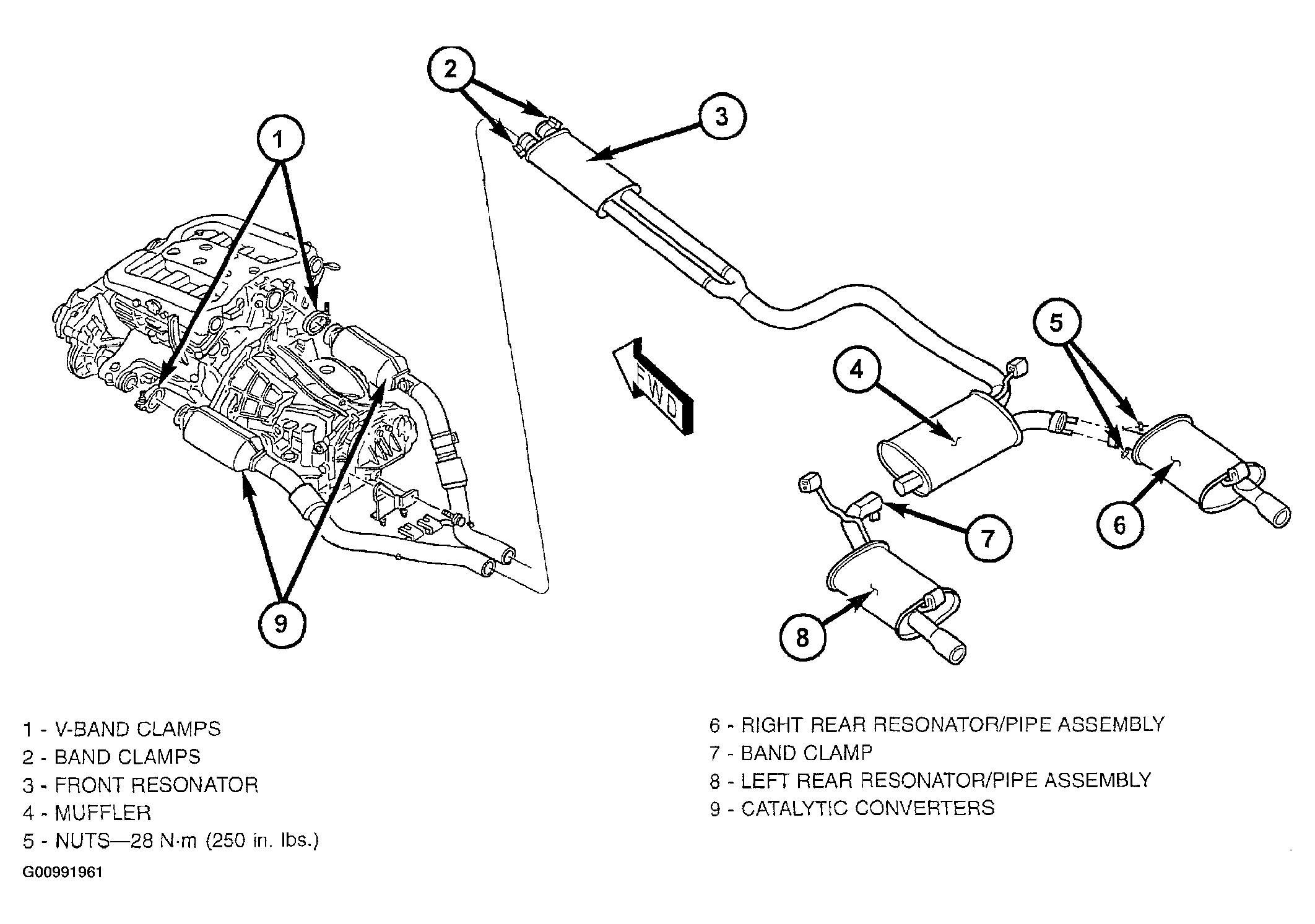 - 300M Special: Tighten right rear resonator/pipe nuts to 28 N.m (250 in. lbs.) (Figure).