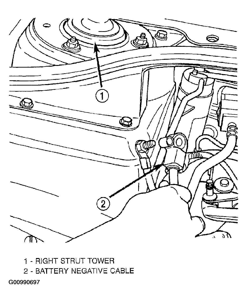 - Disconnect negative cable at remote jumper terminal located at right strut tower (Fig 1).