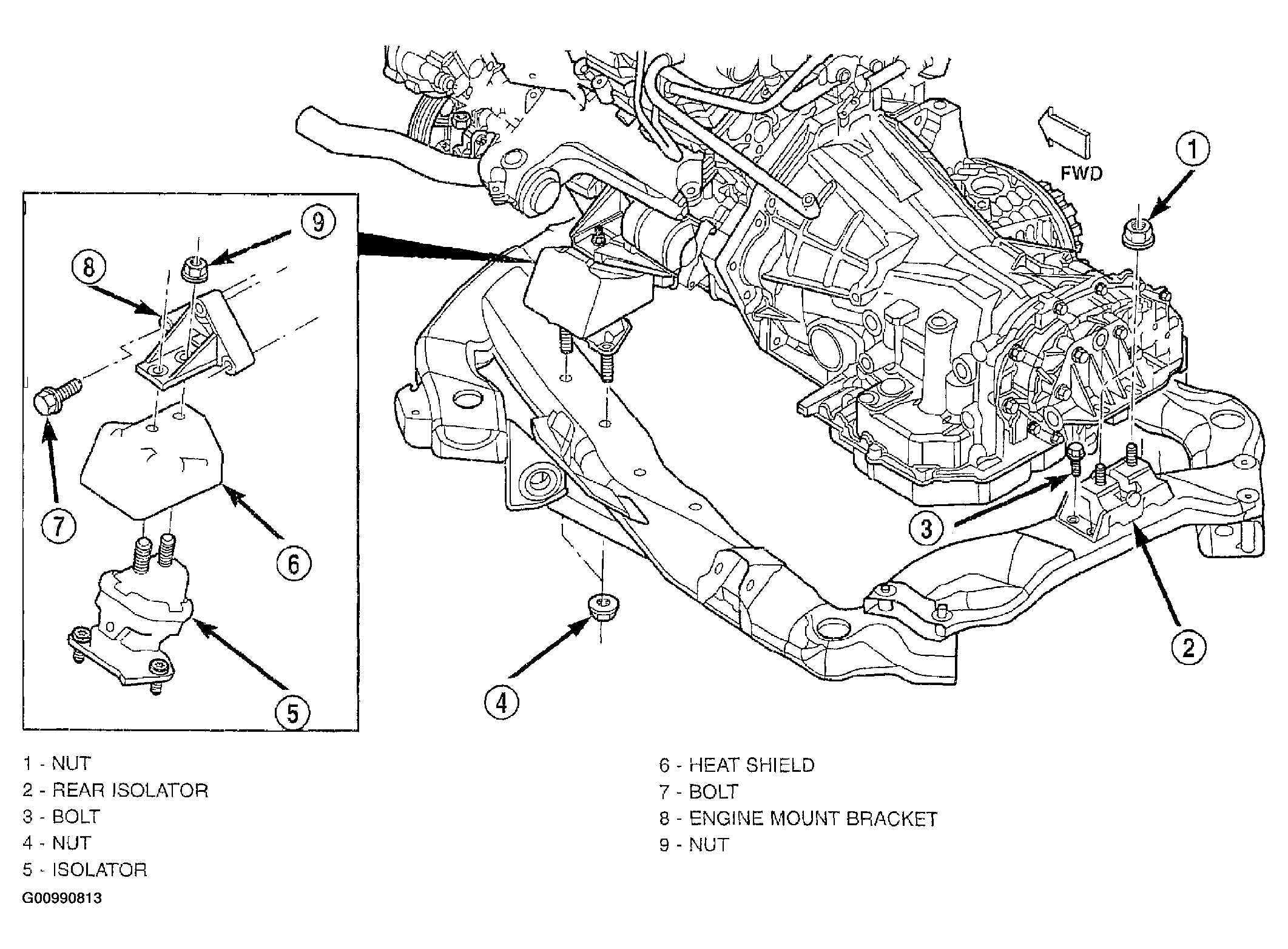 - Tighten the isolator to frame nuts to 61 N.m (45 ft. lbs.) (Figure).