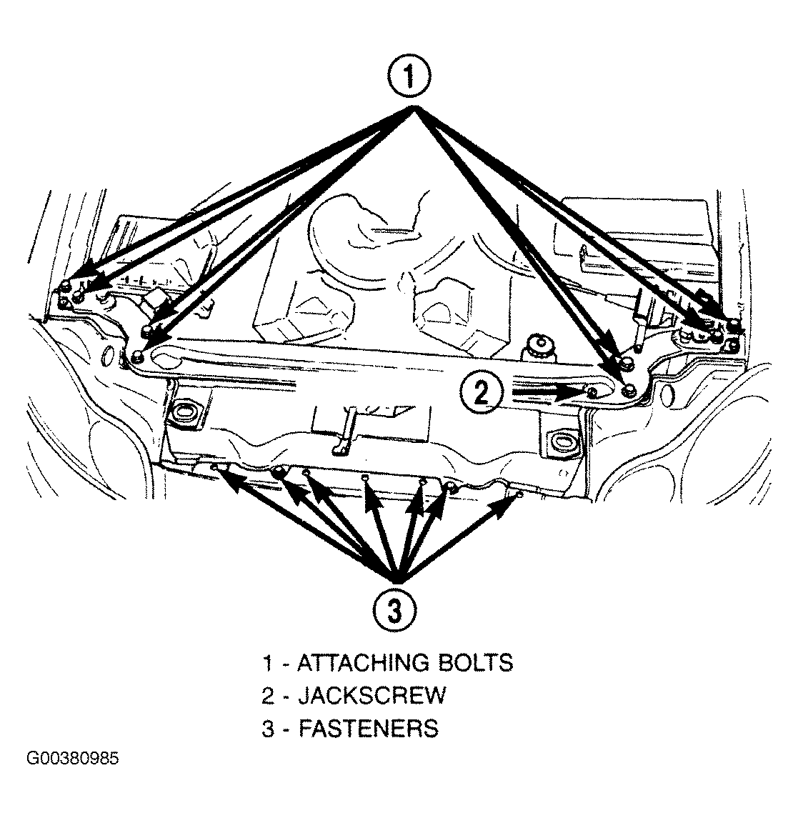 - Install fasteners attaching the forward edge of radiator upper crossmember.