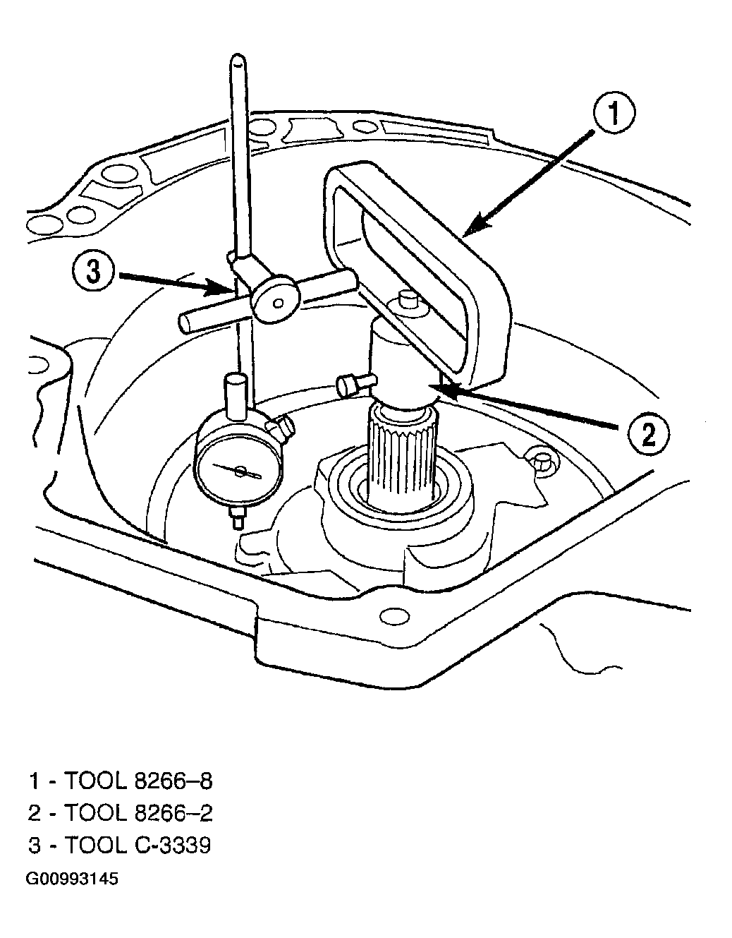 - Measure input shaft end play using Tool 8266. Set up Tool 8266 and a dial indicator as shown in Fig 1. Move input shaft in and out to obtain end play reading. End play specifications are 0.13 to 0.64 mm (0.005 to 0.025 inch). Record indicator reading for reference when reassembling the transaxle. If end play exceeds the specified range, the #4 thrust plate needs to be inspected and changed if necessary.