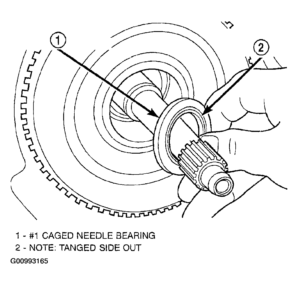 NOTE: The number seven needle bearing has three anti-reversal tabs and is common with the number five and number two position. The orientation should allow the bearing to seat flat against the rear sun gear. See Fig 27. A small amount of petrolatum can be used to hold the bearing to the rear sun gear.