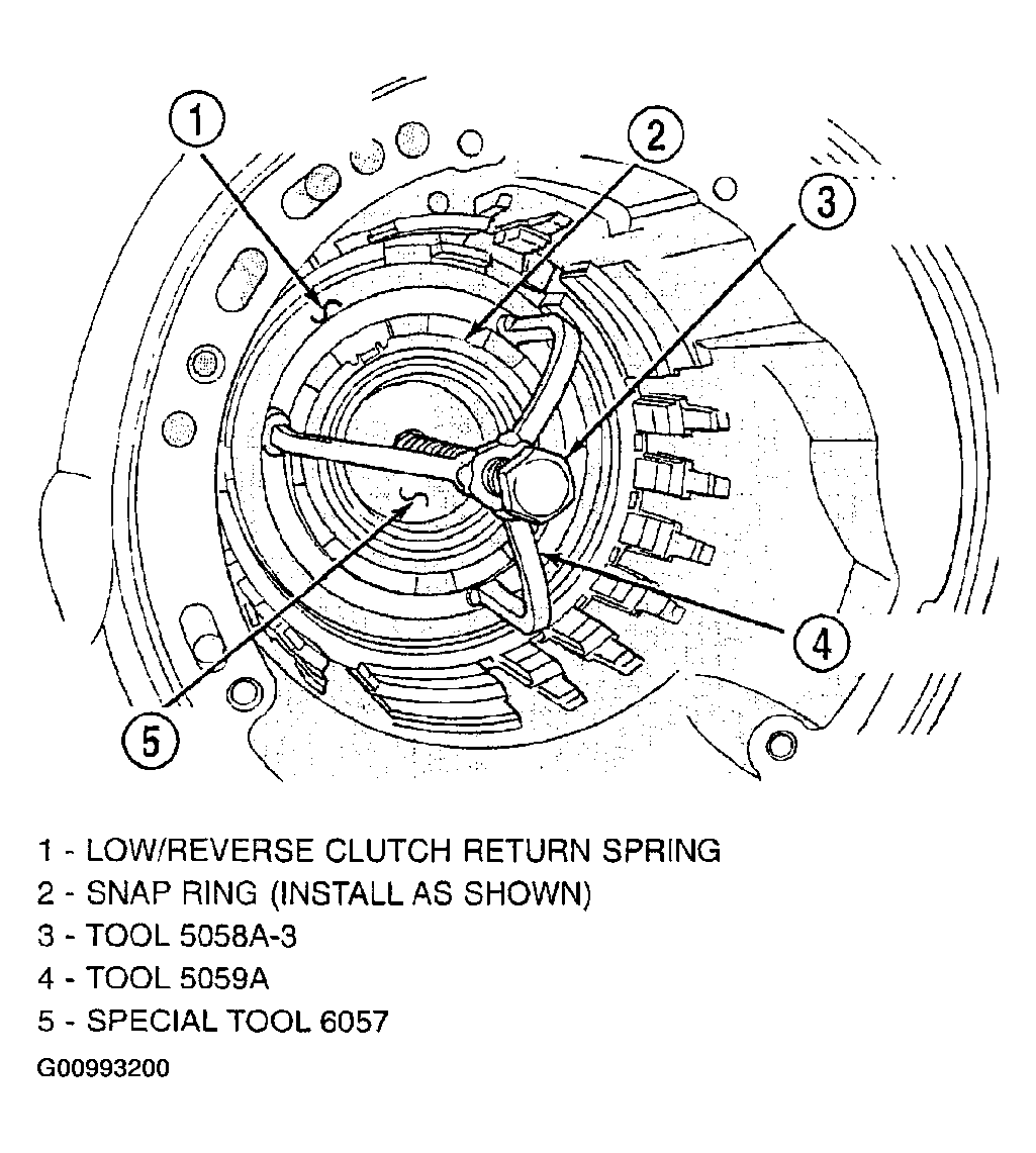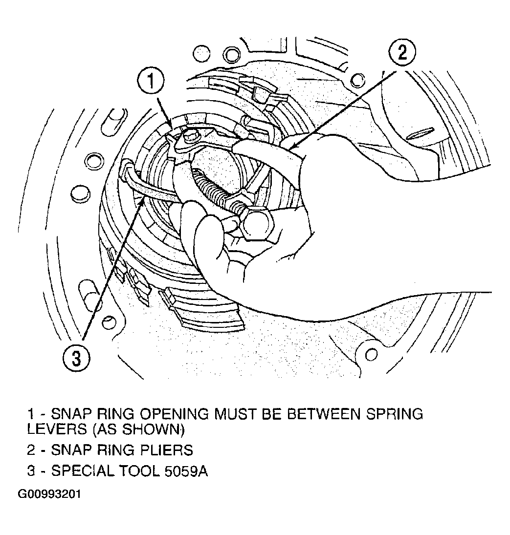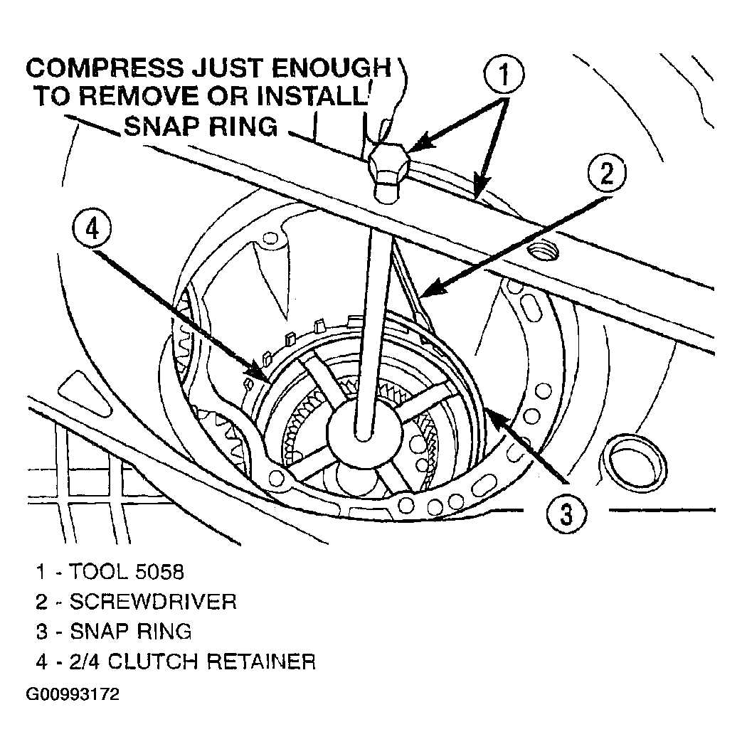 - Install and load Tool 5058 to remove 2/4 clutch retainer snap ring. See Fig 28.