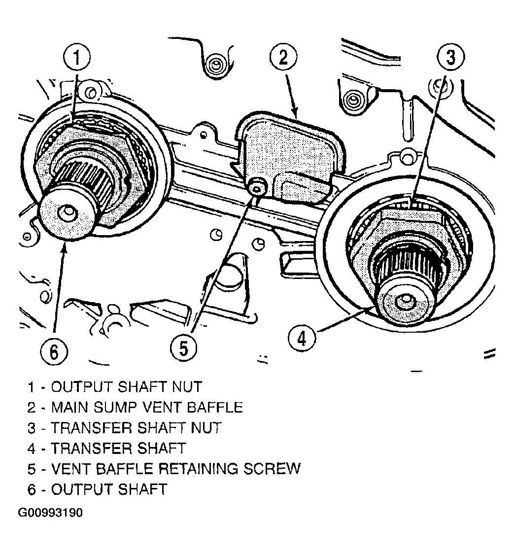 - Remove main sump baffle from transaxle case. See Fig 46.CAUTION: Failure to grind and open stakes of the output shaft nut and transfer shaft nut will result in thread damage to the shafts during nut removal.WARNING: Wear safety goggles while grinding stake nuts.
