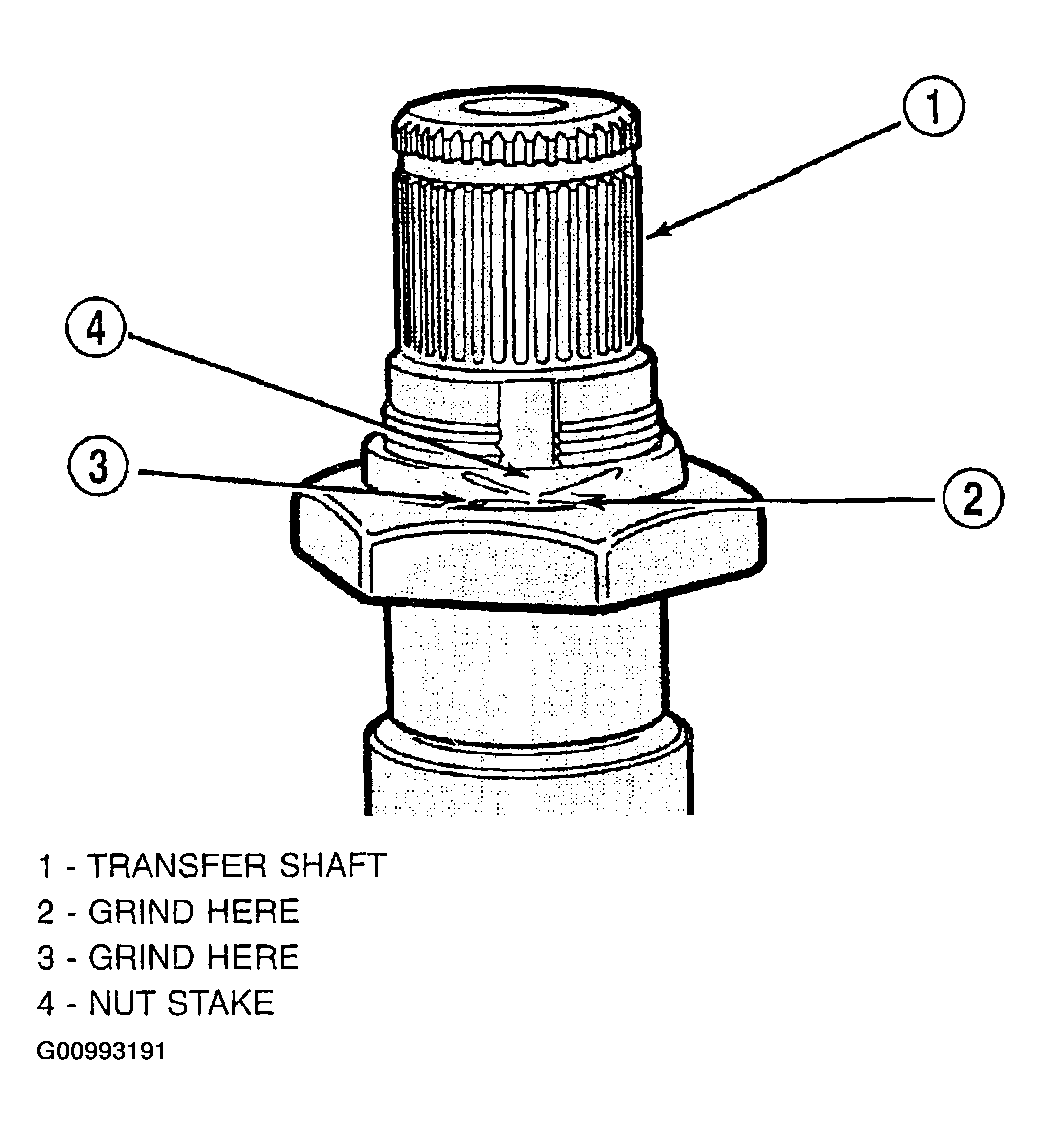 - Using a die grinder or equivalent, grind the stakes in the shoulder of the shaft nuts as shown in Fig 47 and Fig 48 . Do not grind all the way through the nut and into the shaft. There are two stakes on each nut.
