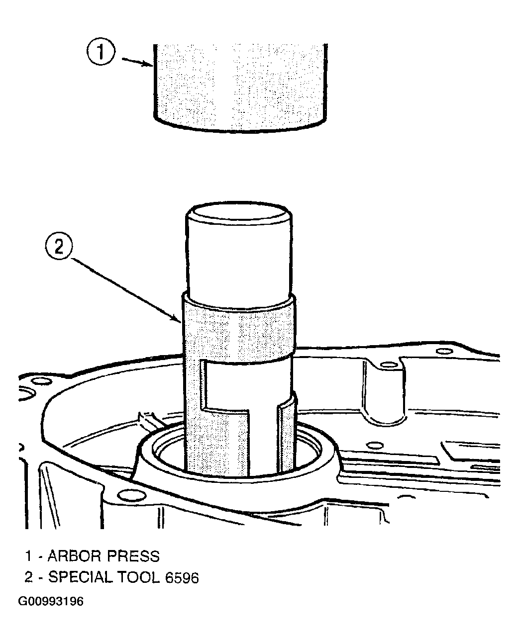 Use special tool 6596 with a shop press to remove front output shaft bearing cup. See Fig 52.